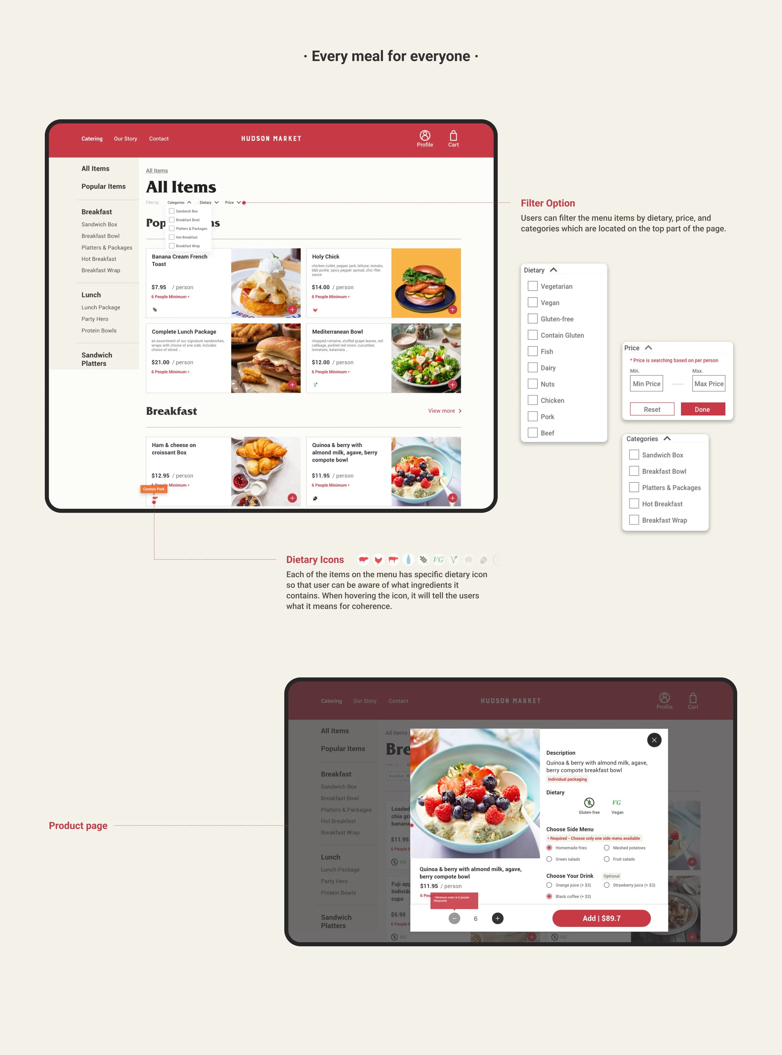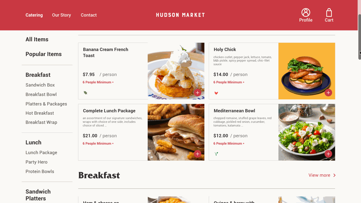 When Users enter the catering menu page, it is categorized by types of meals or cuisines to make it easily navigate. Also, they can filter the menu items by dietary restriction, price, and categories which are located on the top part of the page.