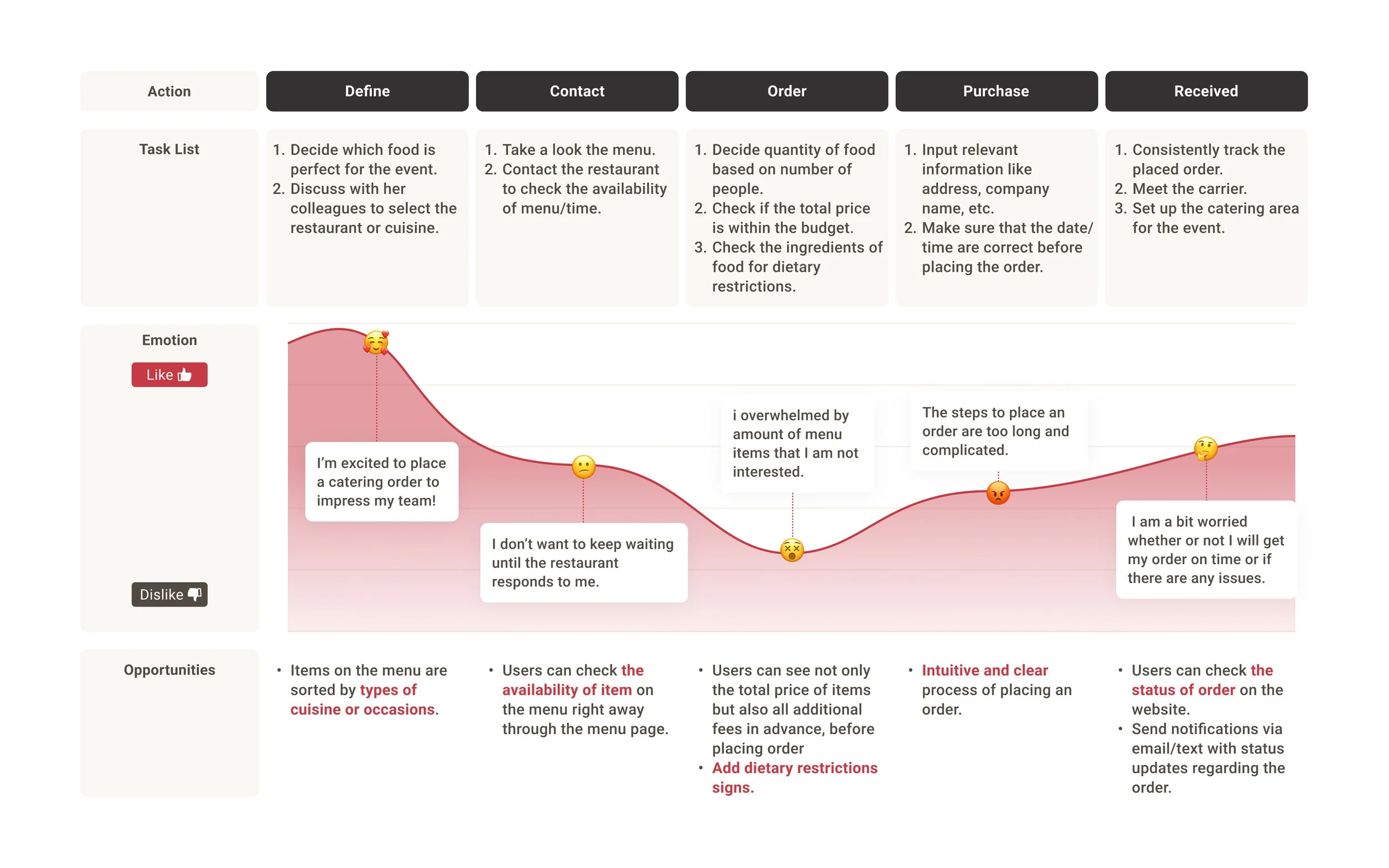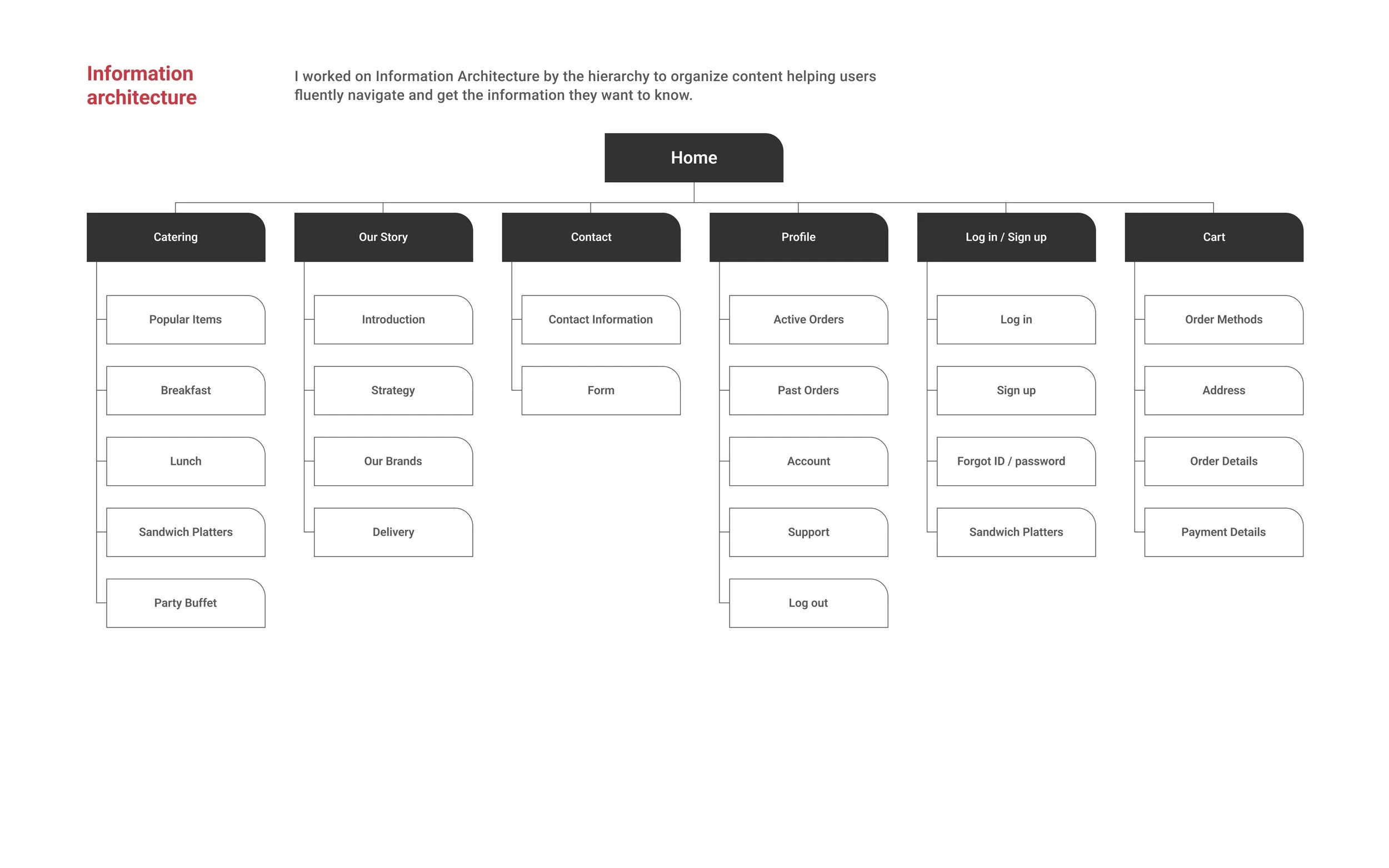 After creating the Persona, User Journey Map, I built User Flow from finding a menu to complete the catering order process. From collecting data on each step in the user flow, I was able to find the three major Insights which allowed me to ideate the solution that would be adjusted in the design.