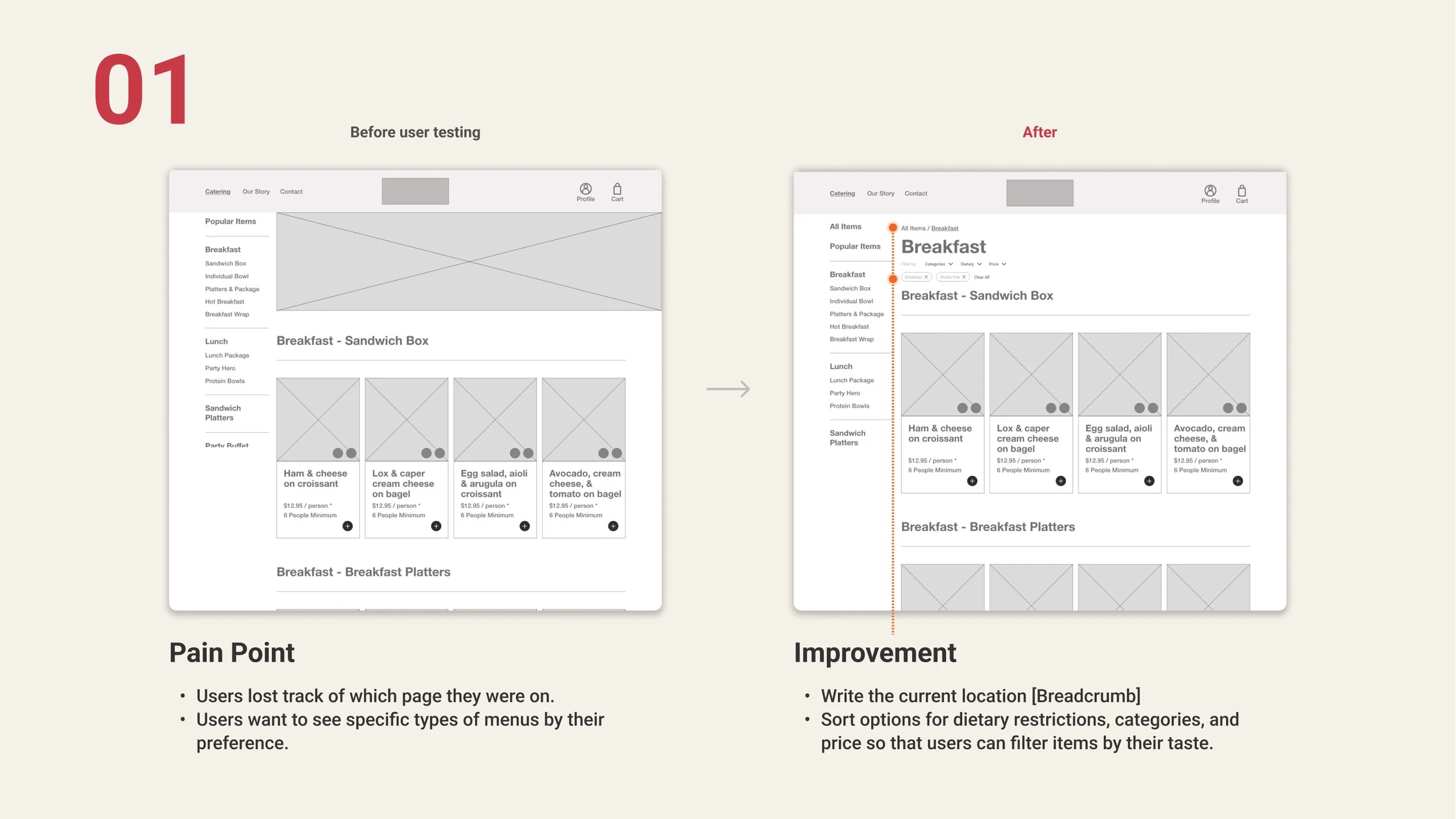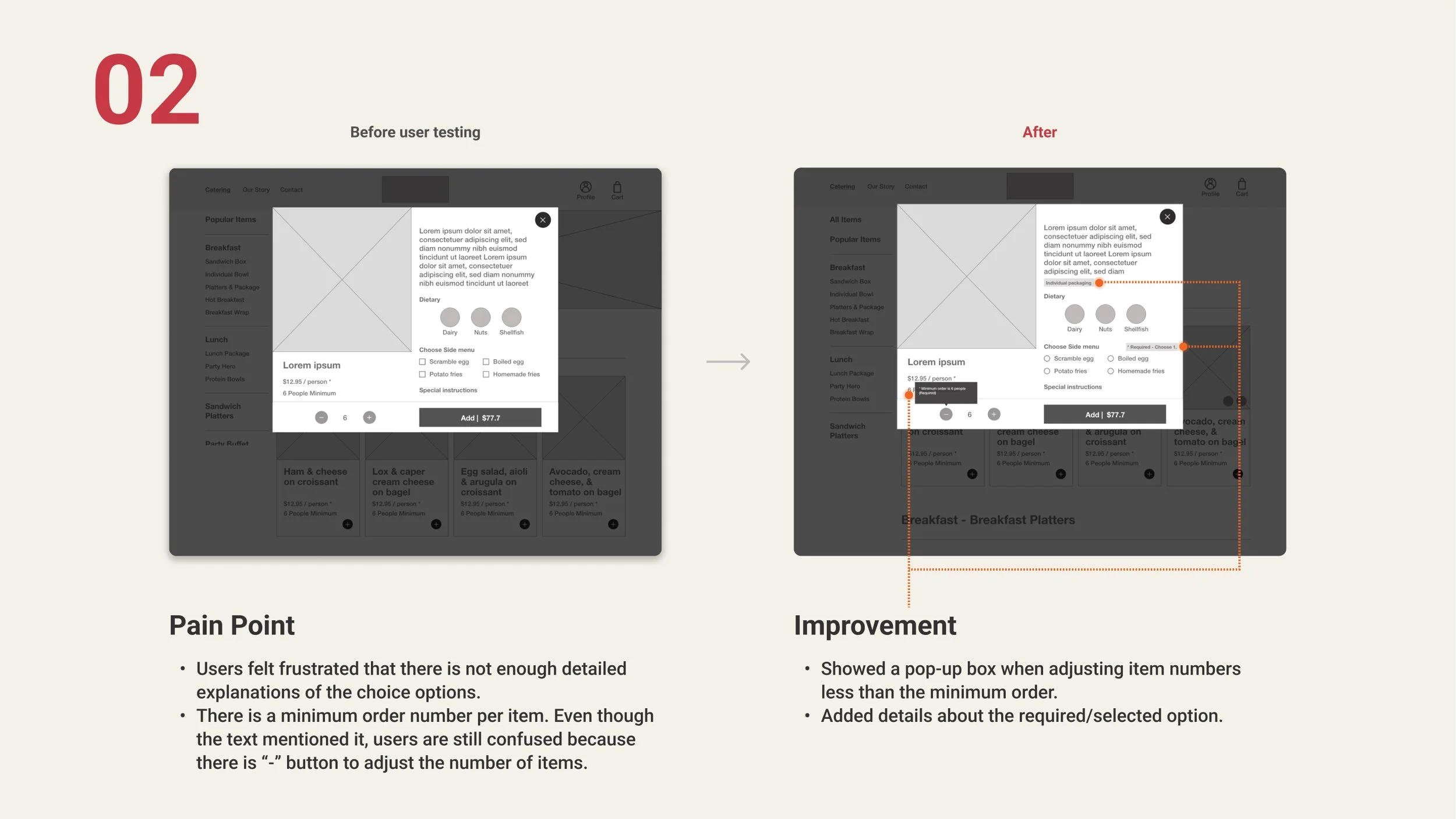 To validate my ideas for the solutions, I conducted 2 rounds of Usability tests with 5 participants. The purpose of the usability test is to find a better user flow for online catering order. As a result, I found some pain points and improvements to make the user experience better. There are 4 major improvements:
